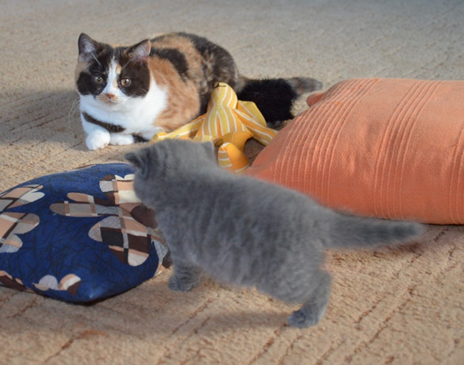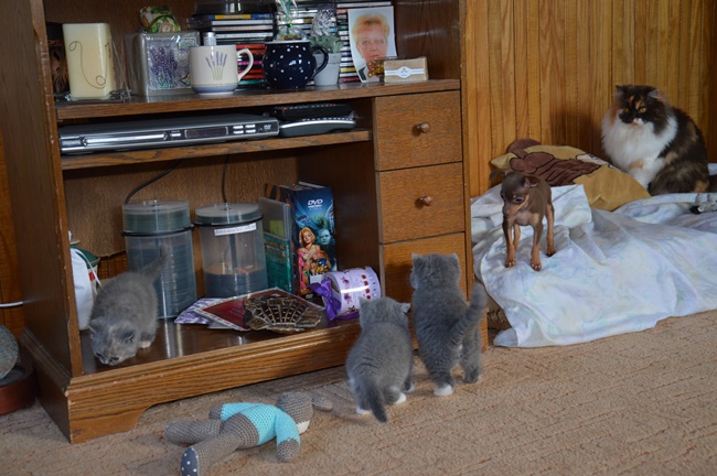 Koťátka začínají prozkoumávat nejen okolí svého pelíšku, ale i další části domácnosti. Provázejí je jejich větší kamarádi :) Uprostřed nádherná Lukrecie a Tifi a malý Leonek se svou kamarádkou Kleopatrou - 4.týdny