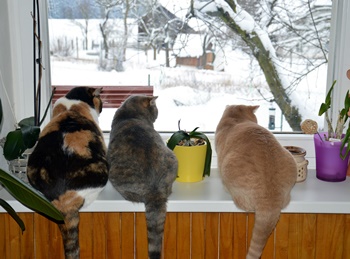 oknem je krásná zima a kočky denně pozorují své "kino" v podobě ptačí